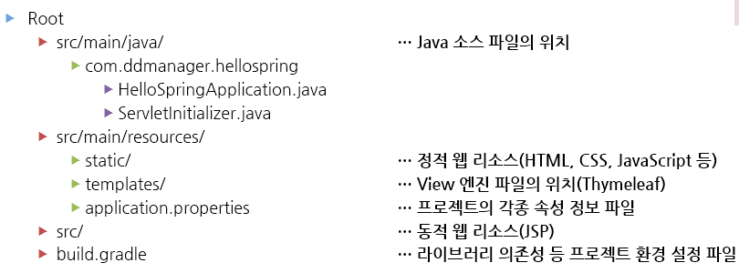 Spring으로 간단한 웹 애플리케이션을 개발하는 데에도 많은 라이브러리 의존성 등 개발자가 설정하는 부분이 많다. 이러한 문제점을 해결하기 위하여 Spring Boot가 등장하였다. 이는 Spring 기반의 애플리케이션을 독립형으로 제작 및 실행할 수 있도록 지원한다. 특히 Starter를 제공하여 라이브러리 관리에 활용할 수 있다. JSP 사용을 위해서는 반드시 WAR 파일로 배포해야 한다. Spring Boot의 프로젝트 구조는 아래와 같다.