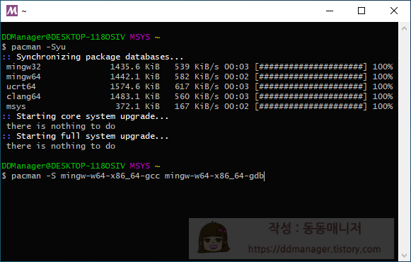 MSYS2 실행 후 명령 창에 아래와 같이 입력합니다.